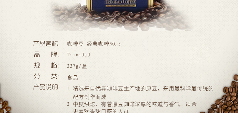 ![]() | 商品名稱 | Trinidad咖啡豆 經典咖啡NO.5? 227g/盒 | ||