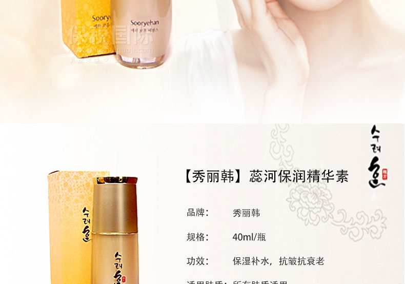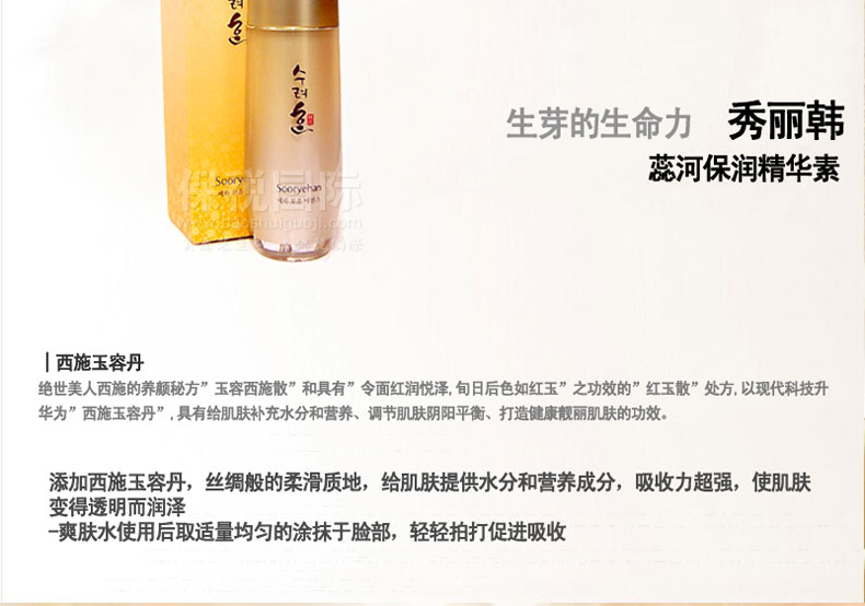 | 產品說明 | 【秀麗韓】蕊河保潤精華素 打造健康潤澤肌膚 40ml/瓶—— 含有玉容西施散及紅玉散配方,以現代科技升華為“西施玉容丹”,調節肌膚陰陽氣血,使皮膚恢復紅潤光澤。 | |||