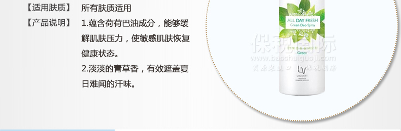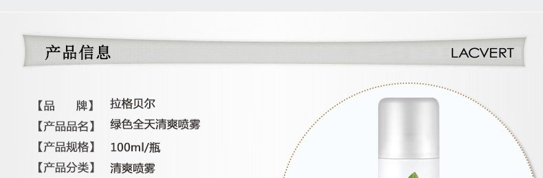 拉格貝爾綠色全天清爽噴霧 綠色心情 全天清爽100ml/瓶—— 1.蘊(yùn)含荷荷巴油成分,能夠緩解肌膚壓力,使敏感肌膚恢復(fù)健康狀態(tài)。 2.淡淡的青草香,有效遮蓋夏日難聞的汗味。