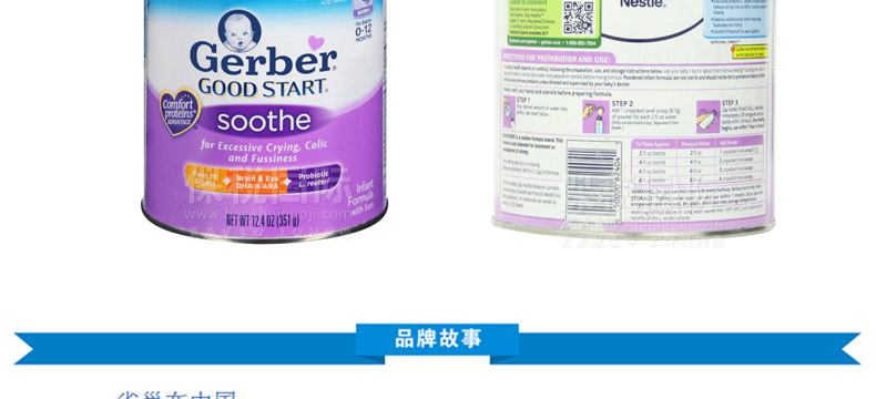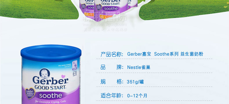 雀巢 嘉寶Gerber Soothe系列 益生菌奶粉 嬰幼兒腸胃專家 —— 1.美國最早添加了益生菌的嬰兒奶粉 2.添加的DHA/ARA促進孩子眼腦發育 3.比普通配方奶粉里更多的鈣質,比全脂牛奶里更多的鐵,維他命C和E為您成長中的孩子提供足夠的營養保障 |
